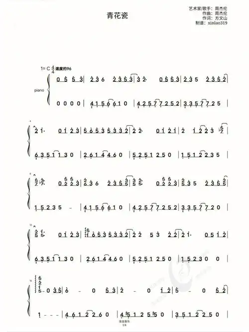 青花瓷 钢琴谱 双手简谱 电子版 独奏 周杰伦 c调 数字谱 附音频