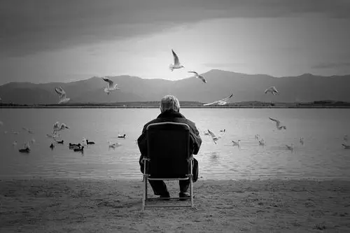 日落孤独,老人独自坐在椅子上看着日落