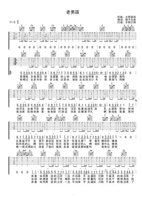 老男孩吉他谱(筷子兄弟演唱 吉他弹唱必学曲目 c调原版指法调式)-舒家