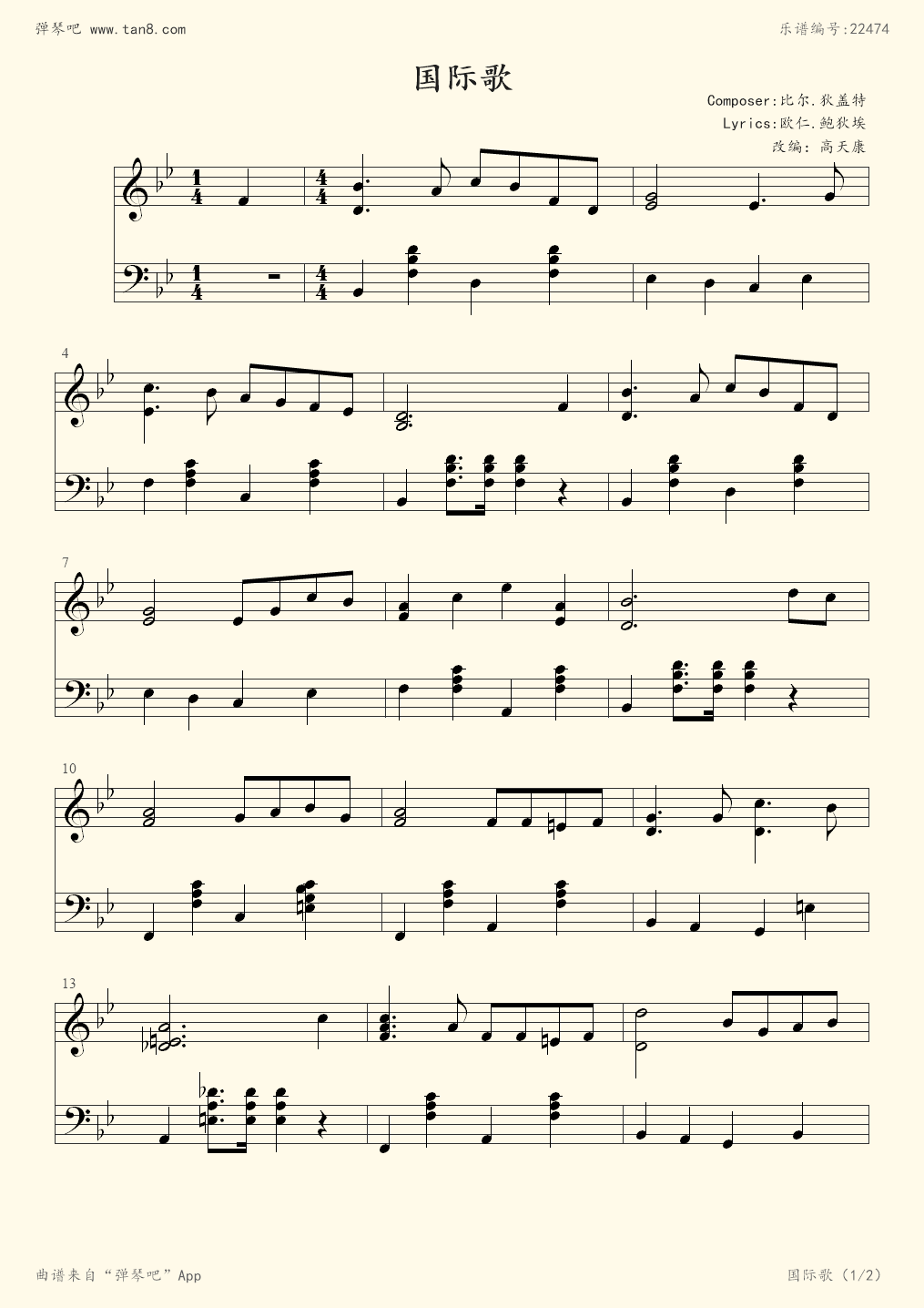 钢琴谱:国际歌(钢琴版,皮埃尔·狄盖特)