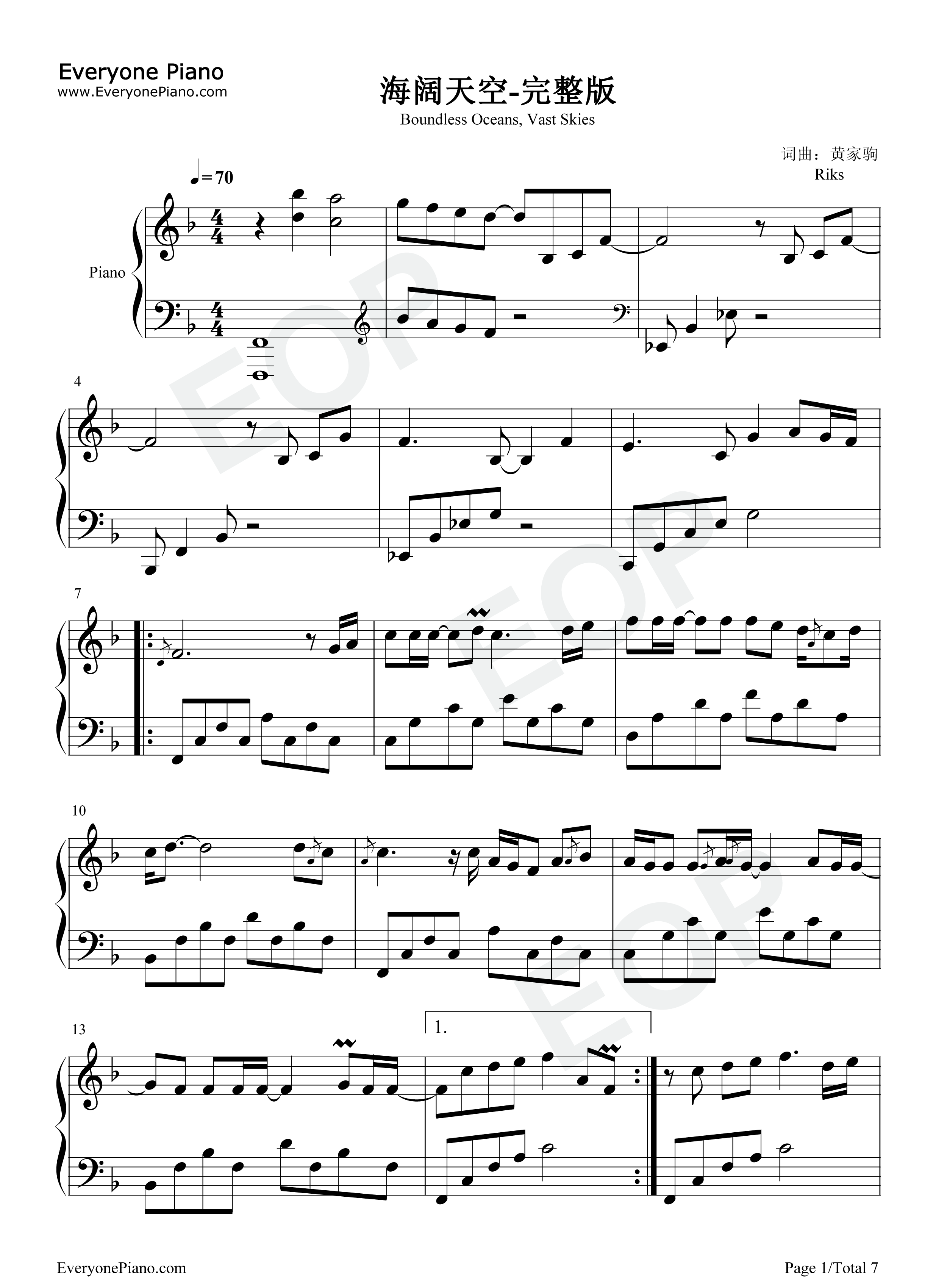 海阔天空五线谱预览1-钢琴谱文件(五线谱,双手简谱,数字谱,midi,pdf)