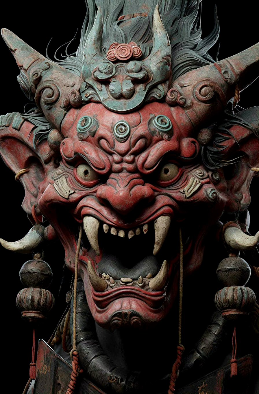 一组ai生成的鬼怪面具,有点像造像之中的怒目金刚.