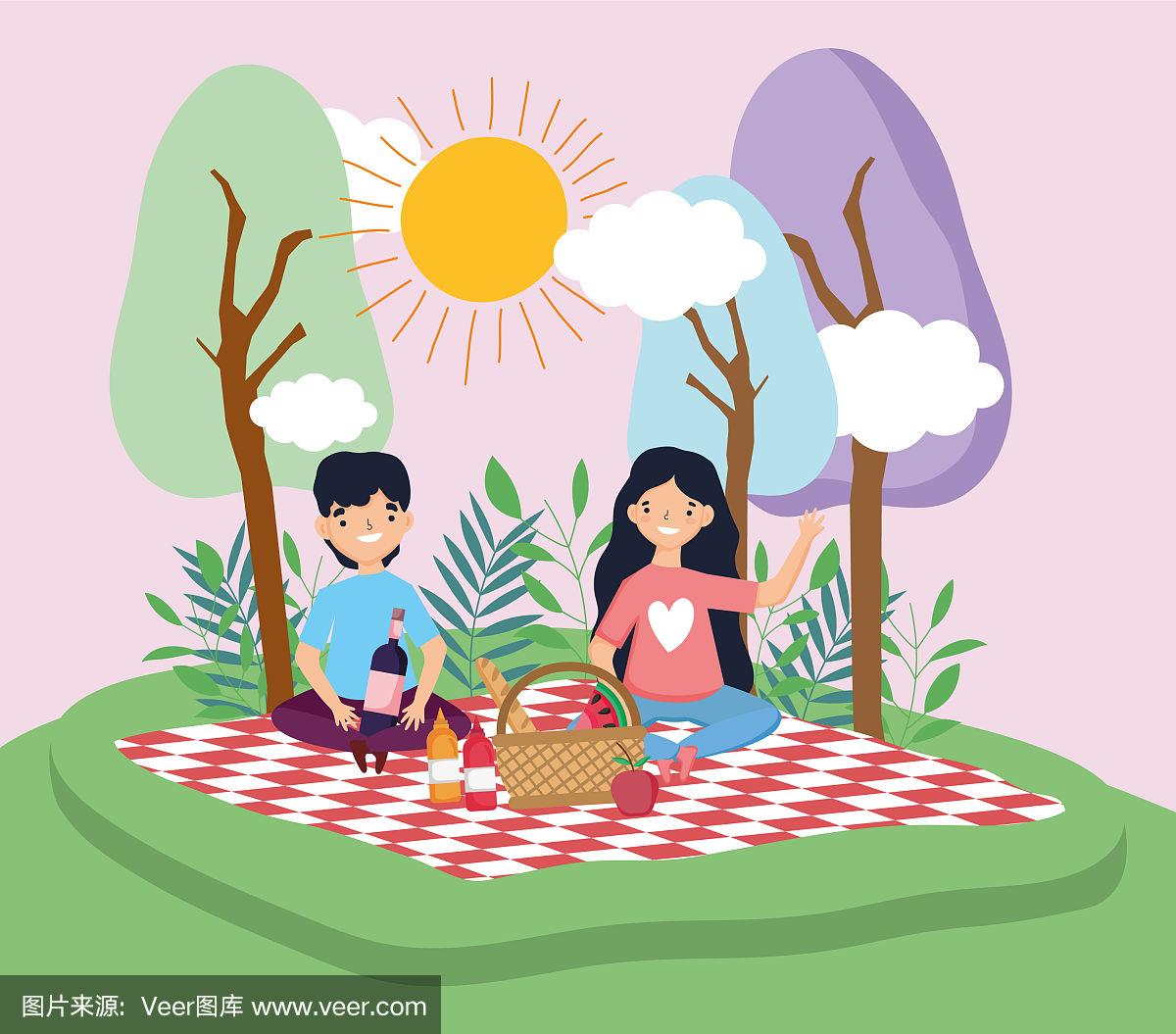 草鞭毛卡通野餐坐在公园毯子上的妇女可爱雌在自然中吃和说话娱乐活动