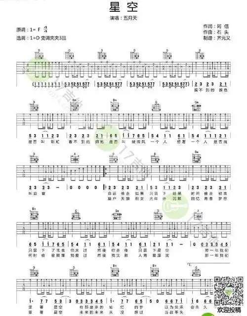 星空吉他谱 d调六线谱_附前奏_五月天1