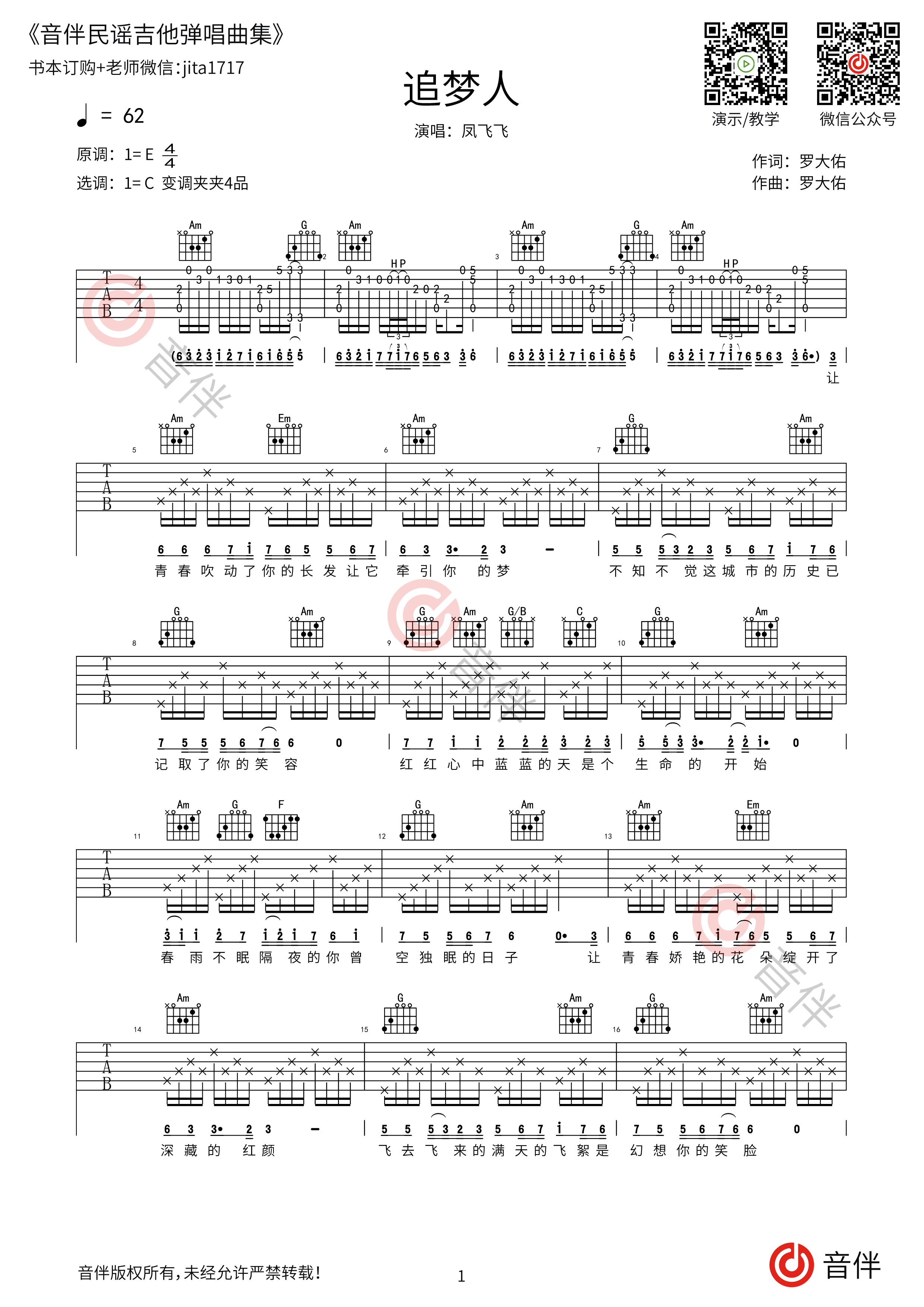 凤飞飞追梦人吉他谱c调指法原版编配附视频教学