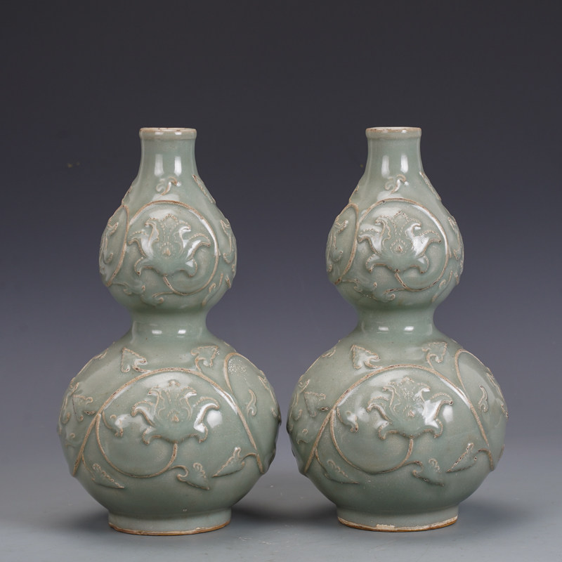 宋瓷收藏官窑青釉雕刻花卉葫芦瓶古董古玩五大名窑旧货收藏品