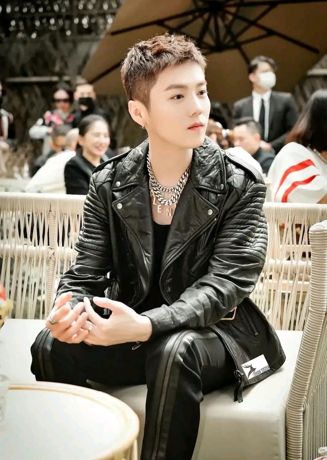 鹿晗的短发造型是标准的精神小伙,寸头搭配皮衣戴大金链子,又霸气又酷