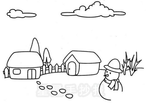 美丽冬天雪景儿童画电子版小学生冬天乡村家乡雪景风景简笔画线稿