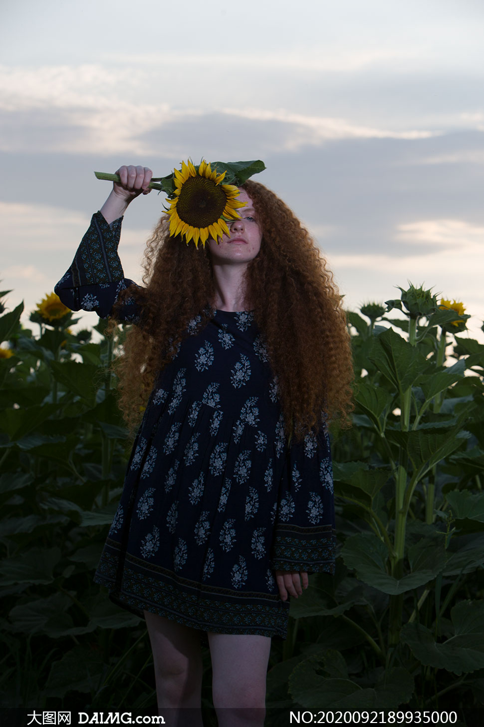 向日葵遮眼的长发美女写真原片素材
