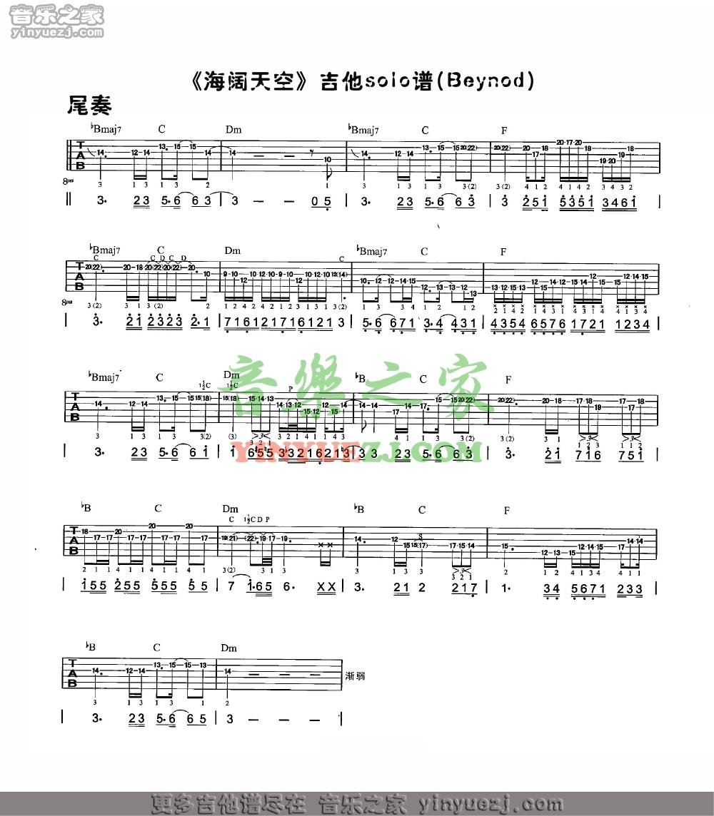 求beyond海阔天空结尾solo吉他谱,最好是c调的,或者f调