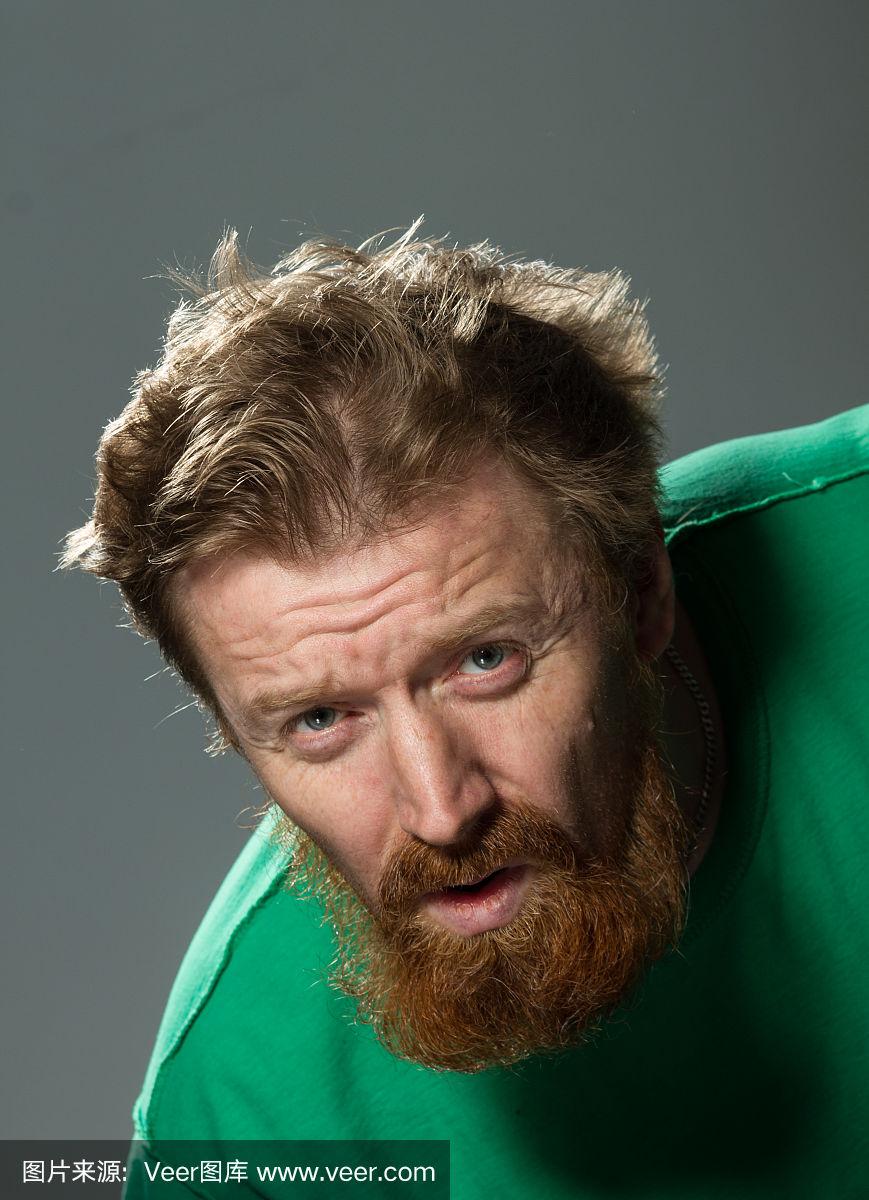 张大嘴巴的男孩年轻快乐的红胡子小伙子,蓝眼睛,张大嘴巴照片