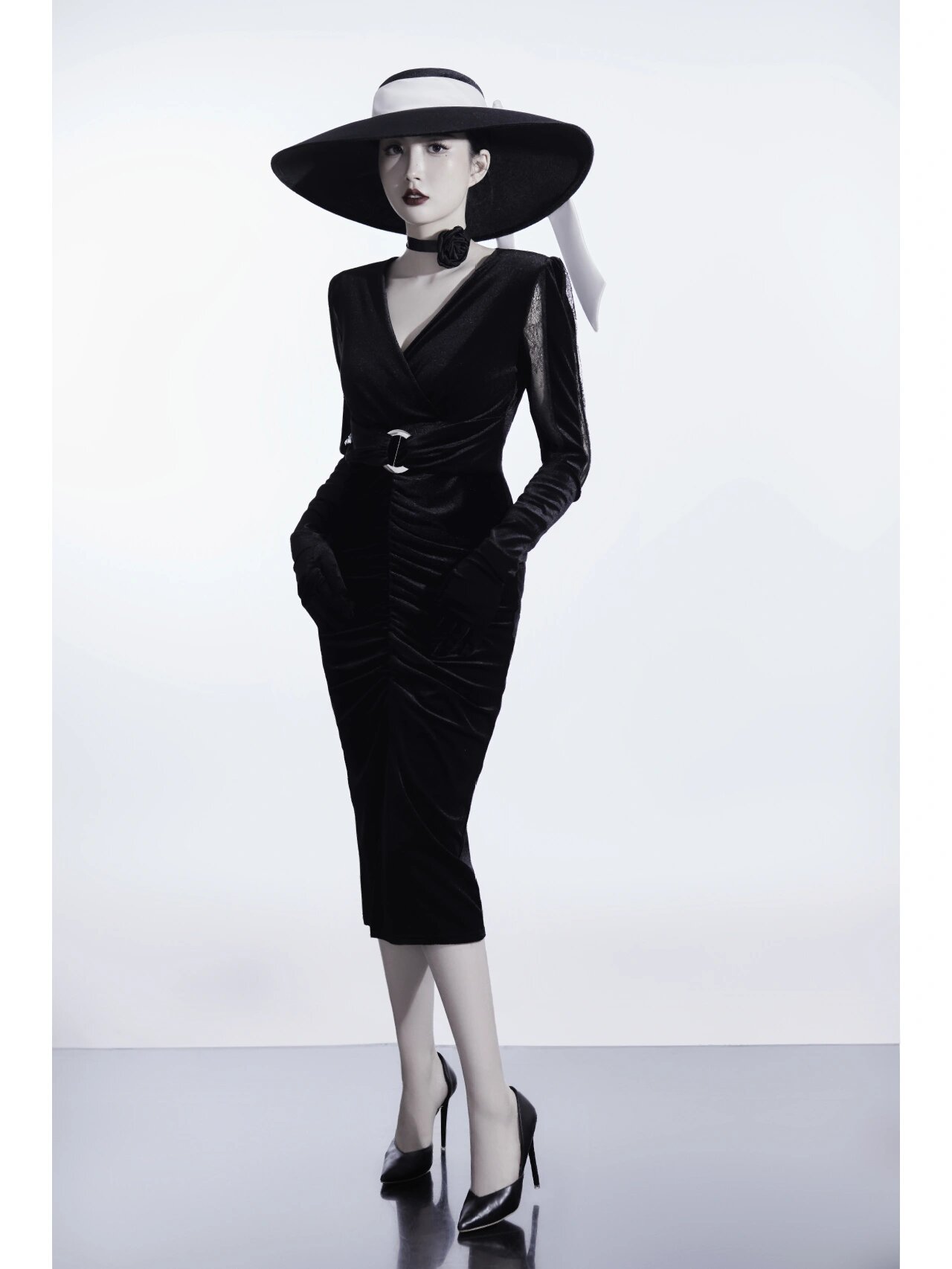 高贵冷艳深沉黑色带着独特的神秘丝绒的质感自带氛围光裙身是经典优雅