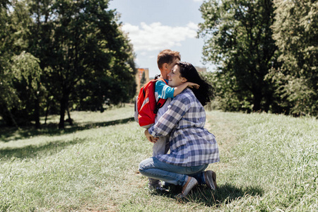 妈妈拥抱她的儿子.女人在大自然里花时间和孩子在一起.