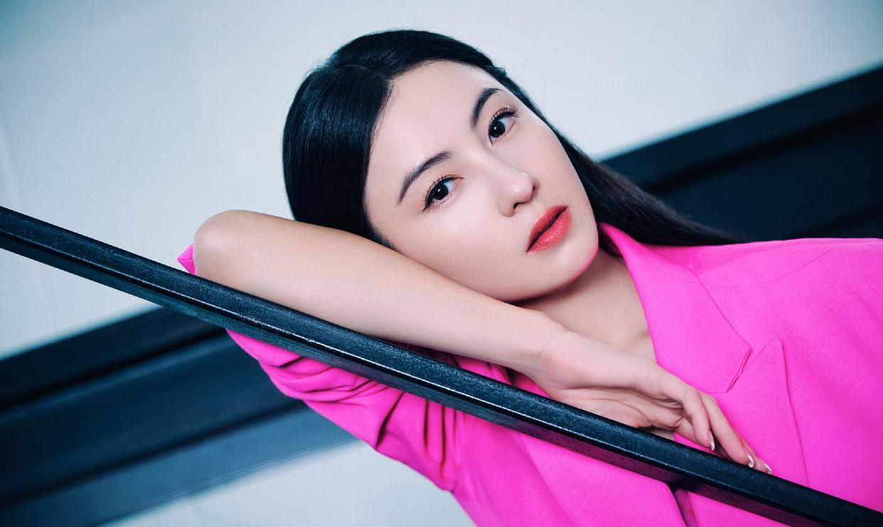 张柏芝芭比粉造型大片,乌黑长发顺直浓密,粉红色亮眼西装与整个人气质