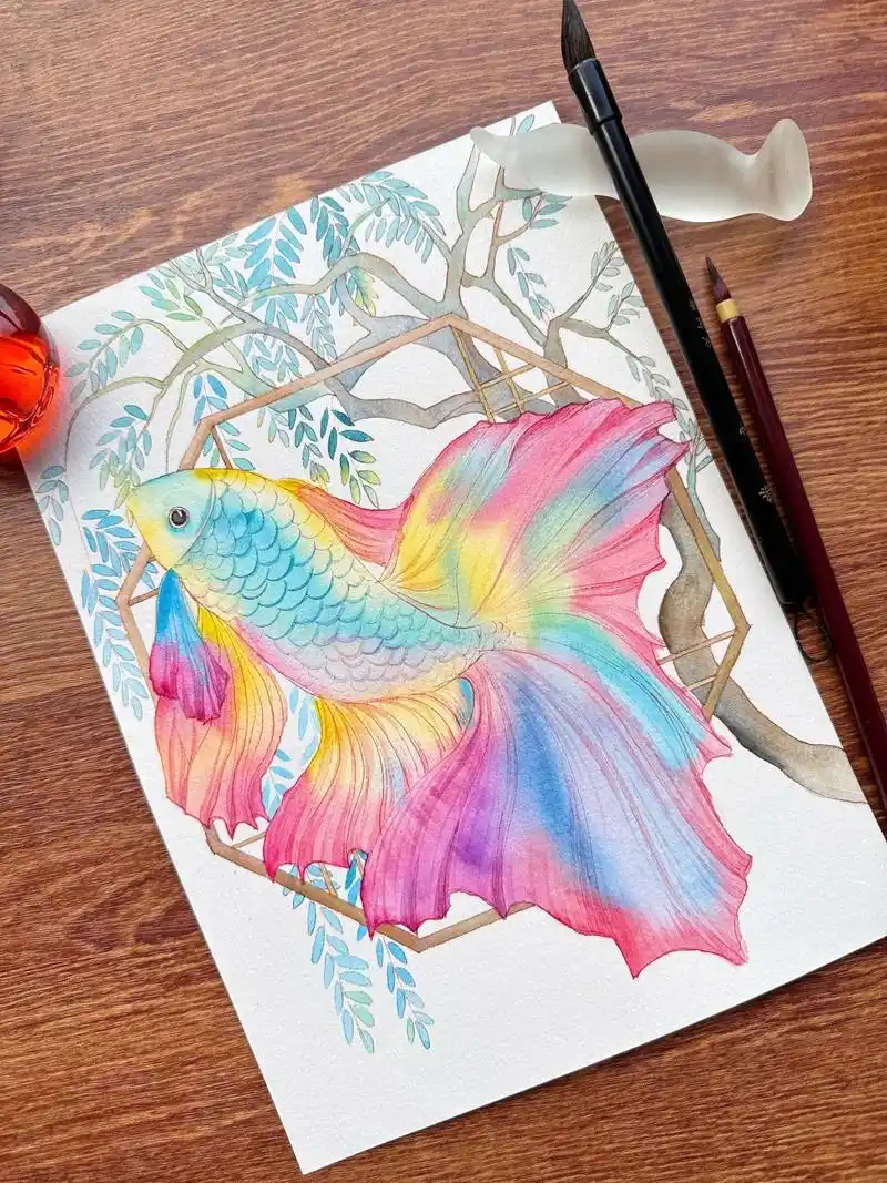水彩斗鱼插画/内附线稿和图文教程.#水彩 #画画 #一起学画 - 抖音