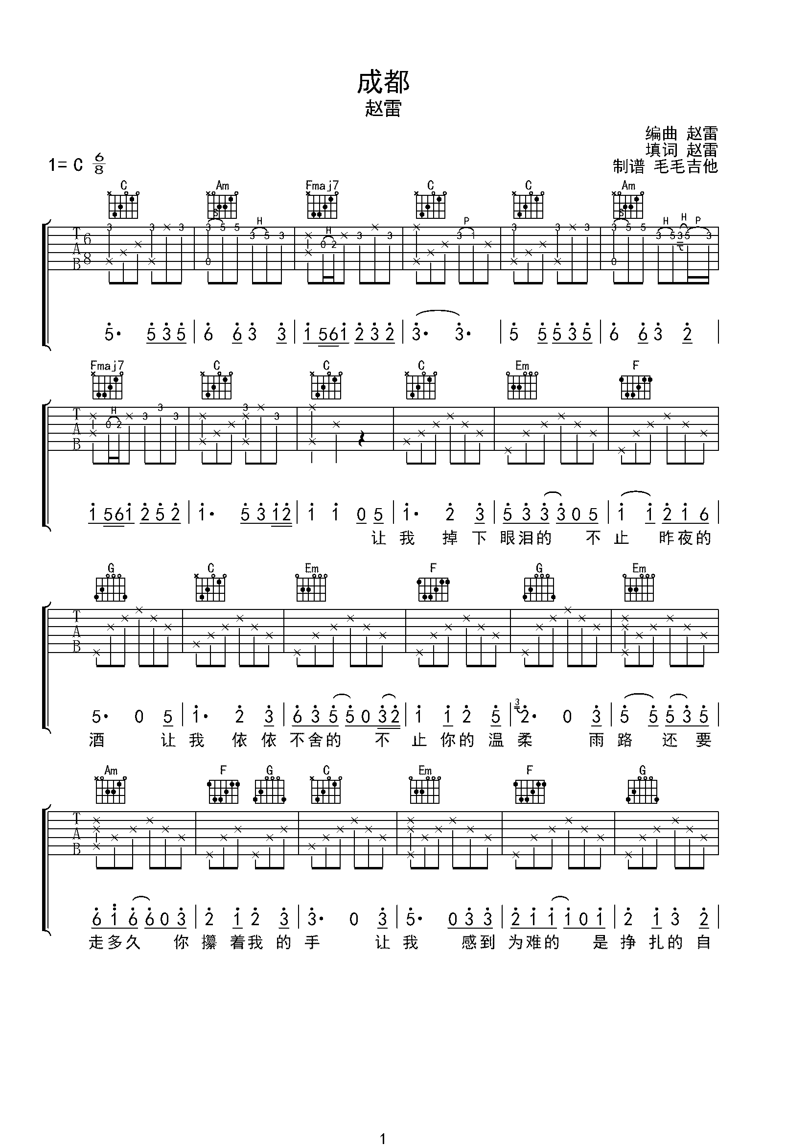 成都吉他谱 c调简单版_音艺吉他编配_赵雷-看谱啦