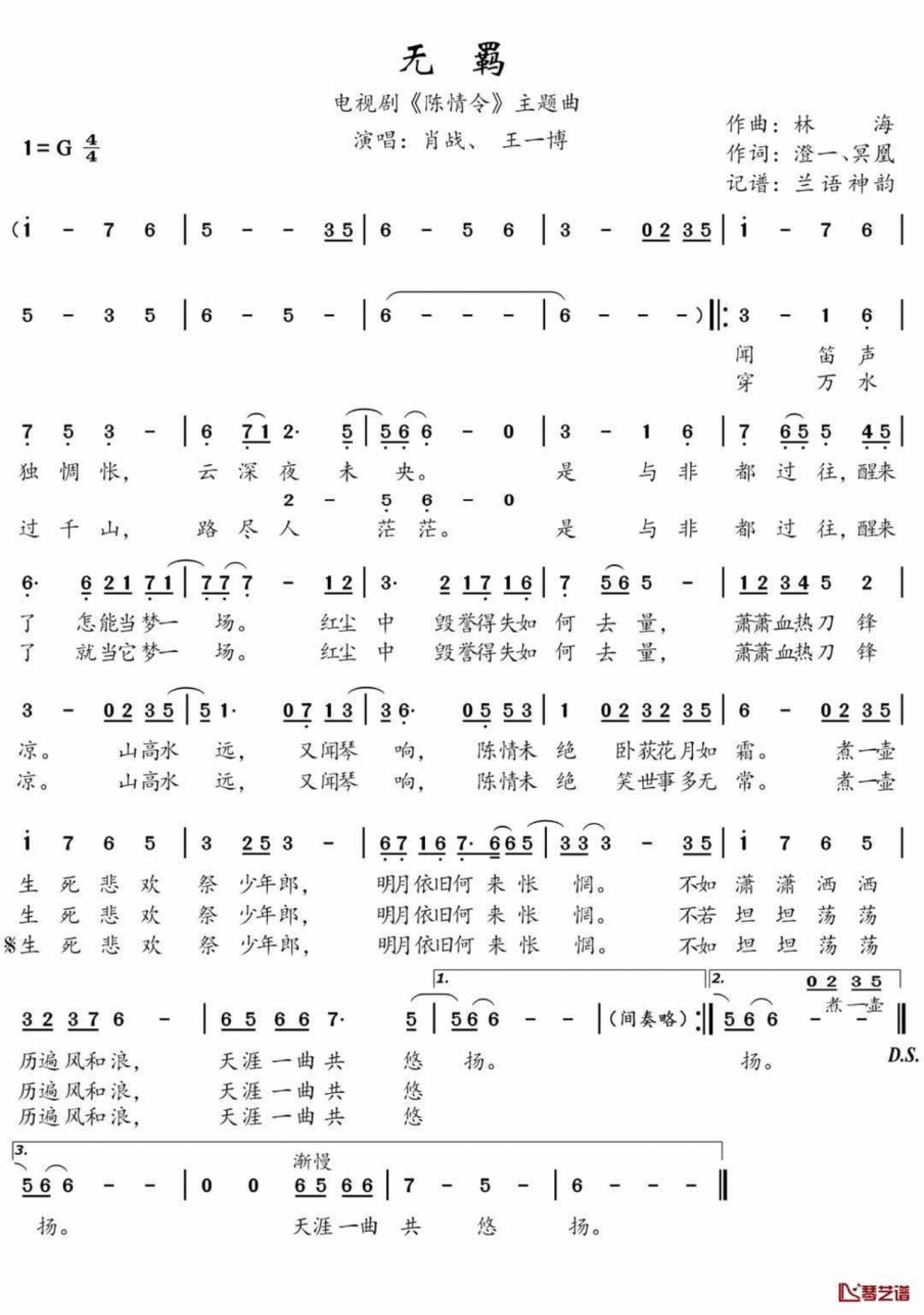 无羁(电视剧《陈情令》主题曲)曲谱,吉他谱简谱歌词-西西音乐下载站