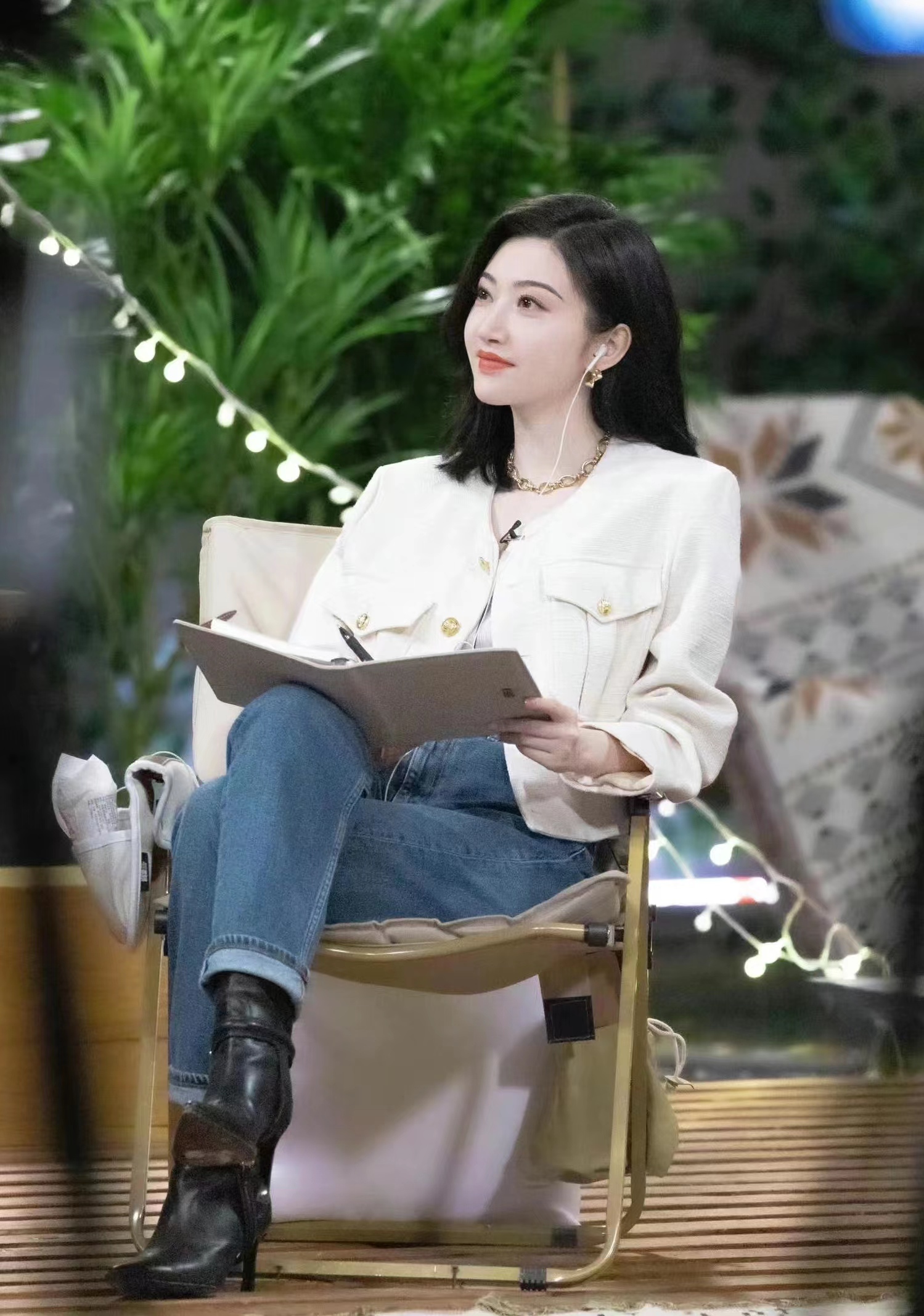 景甜机场街拍图身穿紧身牛仔裤踩白色皮短靴时尚风情