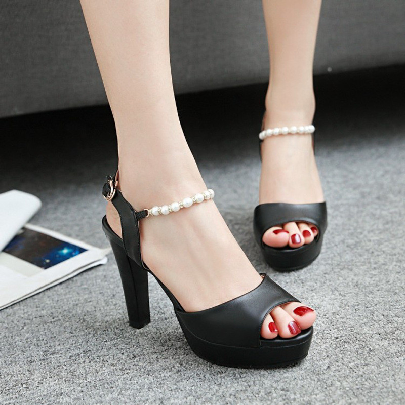 2017款高跟凉鞋女防水台鱼嘴粗跟女鞋串珠浅口百搭性感气质鞋