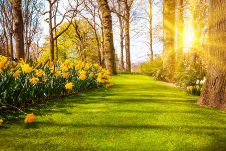 春天阳光明媚的风景. 五月早晨生动的阳光. 愿大自然. 春天的背景.