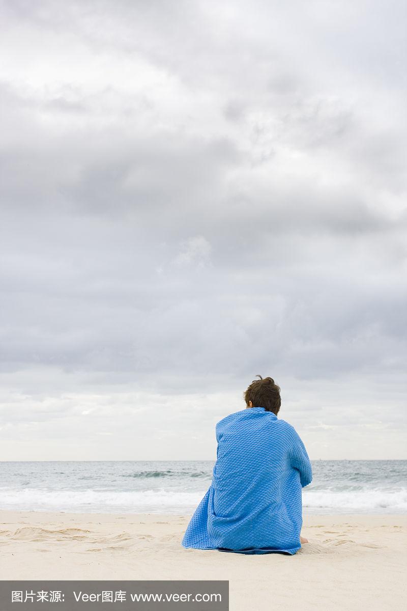 孤独的女人坐在海滩上