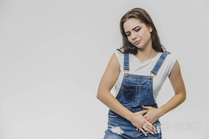 捂着肚子感受着痛苦的情绪她辛苦工作后感到疼痛一件漂亮的白色t恤