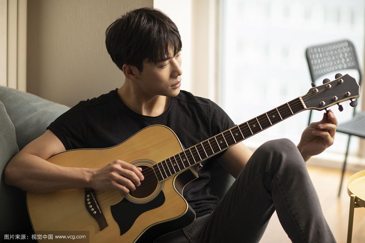 年轻男士在家弹吉他