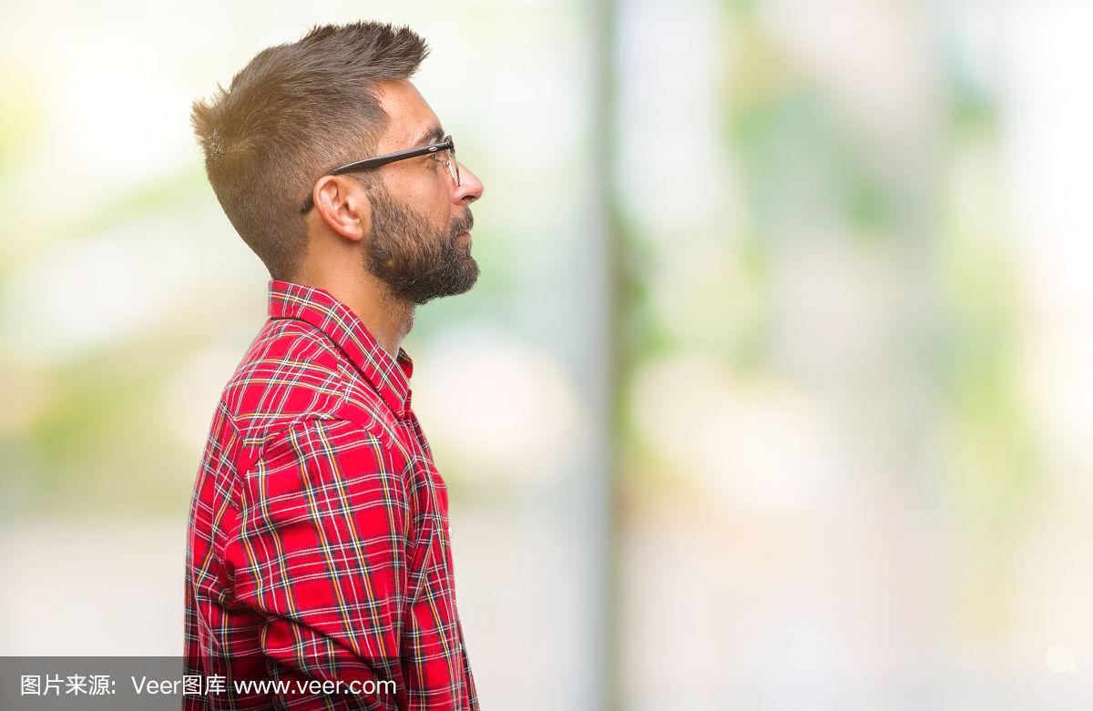 成年西班牙男子戴眼镜孤立的背景看向一边,放松的侧面姿势与自然的脸