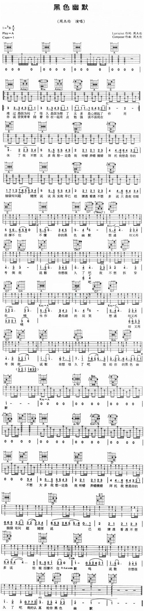 周杰伦黑色幽默吉他谱a调吉他弹唱谱