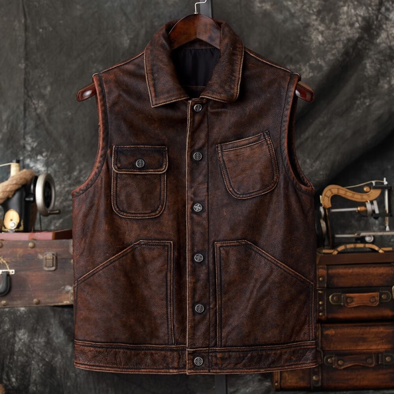 复古脏洗旧工装马甲头层薄牛皮机车皮衣男士真皮户外多口袋皮背心