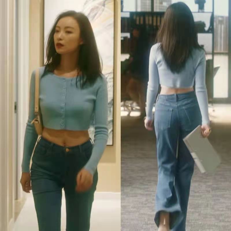 倪妮流金岁月同款气质ol通勤白领小西装外套 高腰直筒蓝色牛仔裤