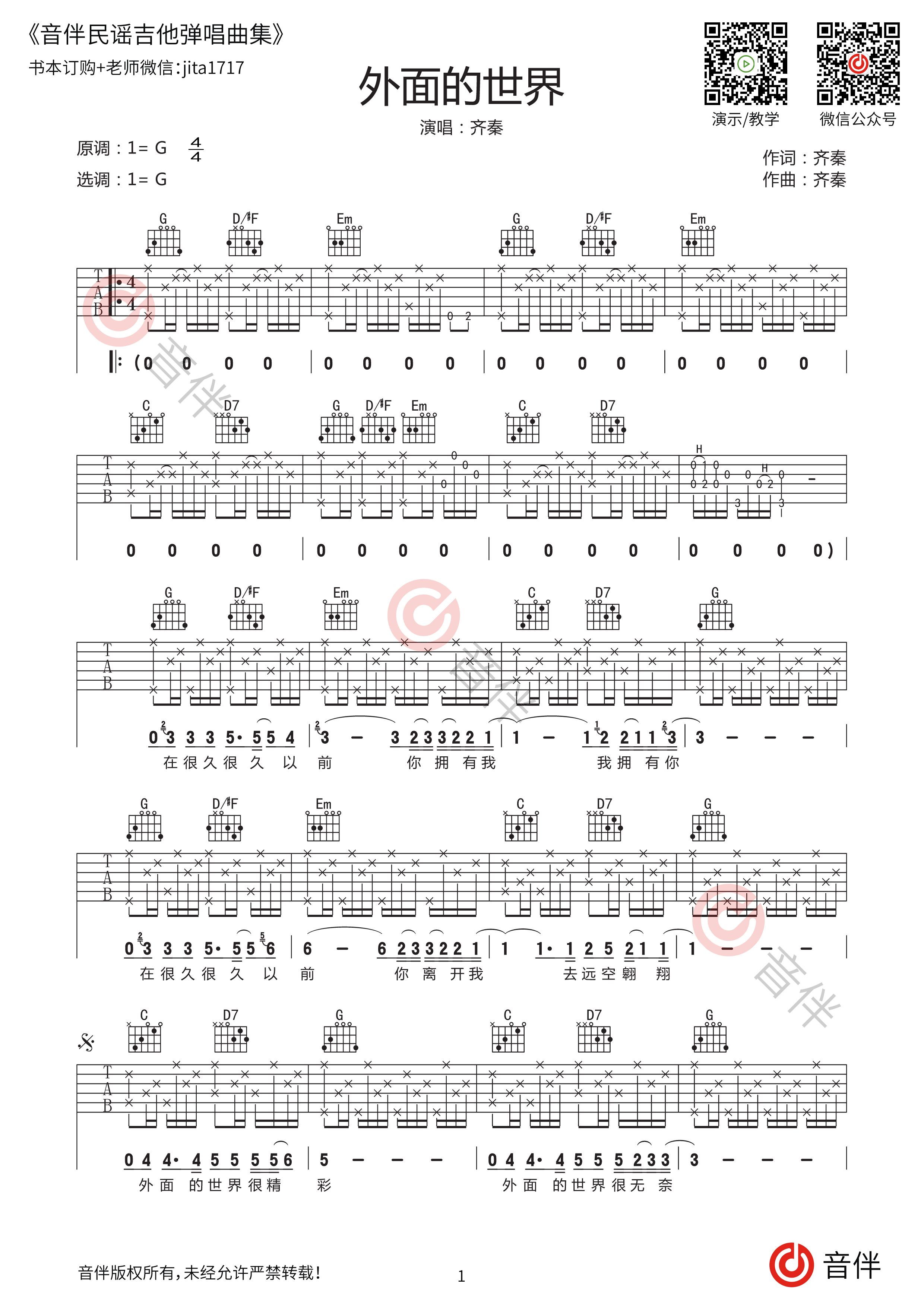 外面的世界吉他谱齐秦g调高清弹唱谱视频教学