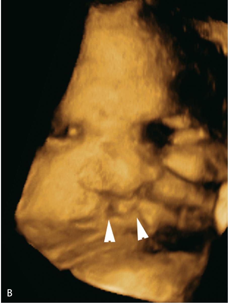 1.3双侧唇裂.(b)同一胎儿的三维图像显示双侧唇裂(三角箭头).图6.1.