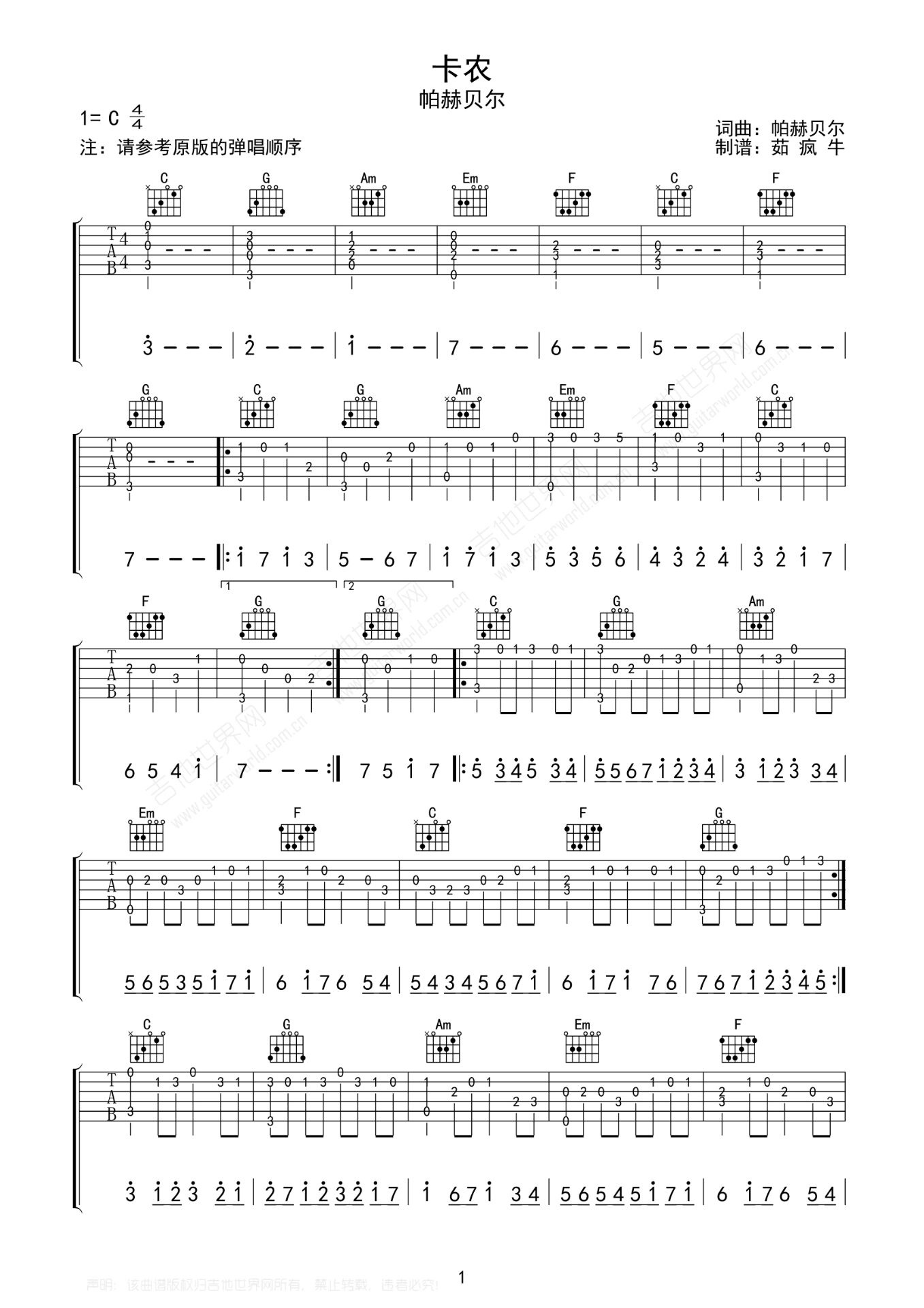 经典吉他谱卡农指弹版
