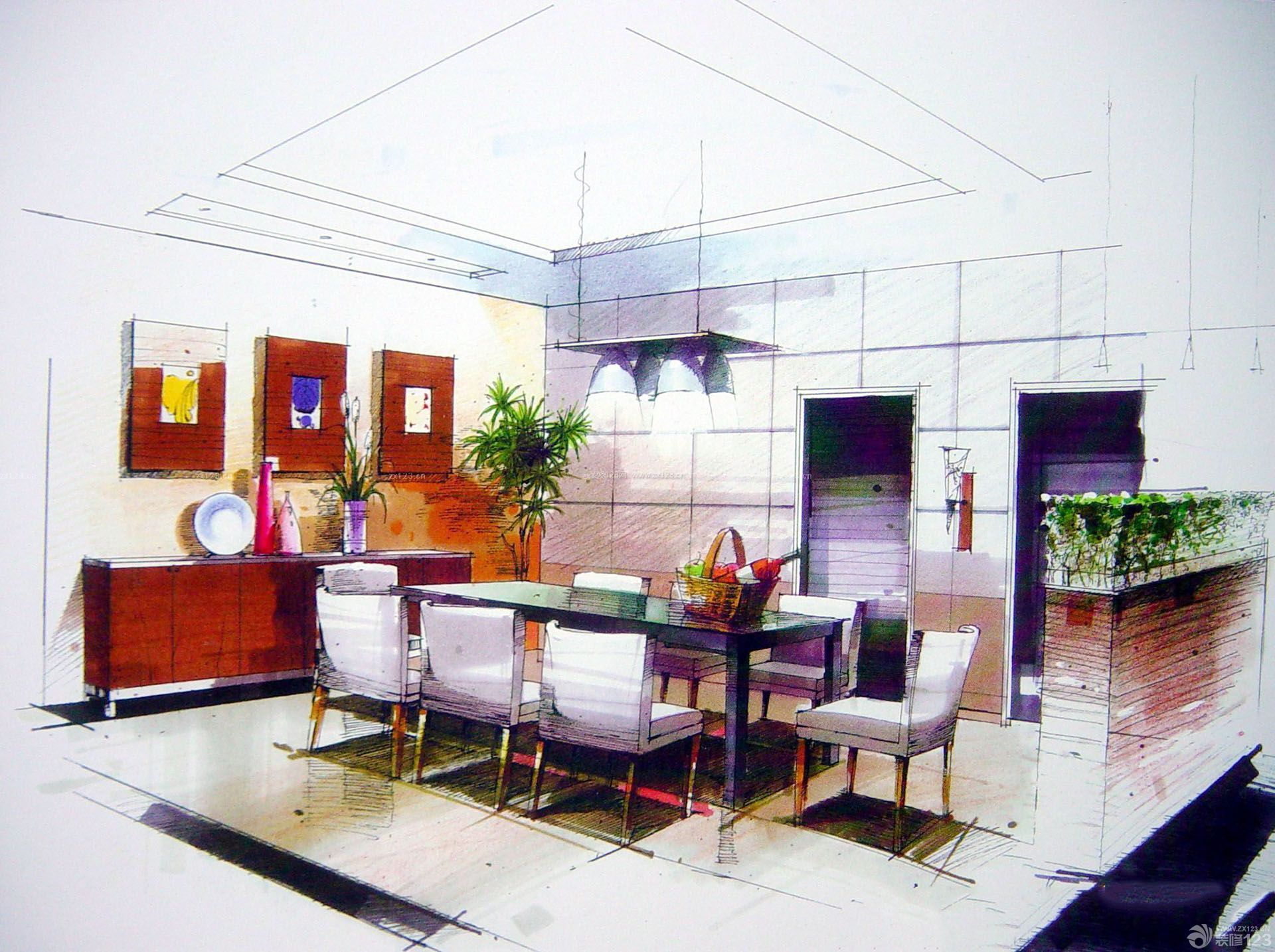 两室两厅室内餐厅设计手绘效果图