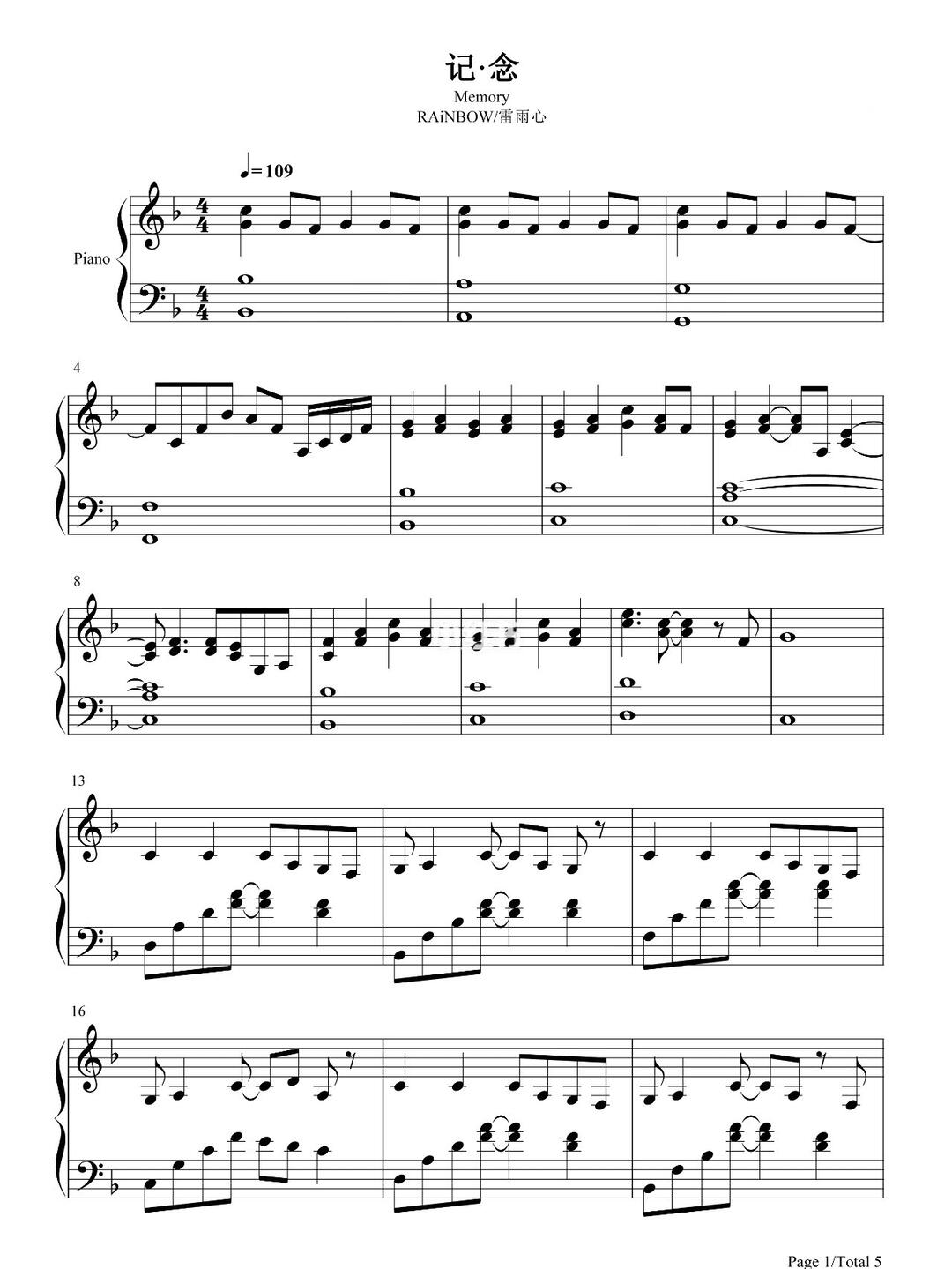纪念钢琴谱 雷雨心《纪念》五线谱