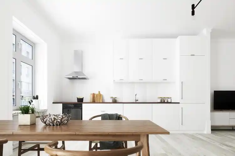 紧凑高效的厨房布局,明亮的白色橱柜与现代化家电相结合.