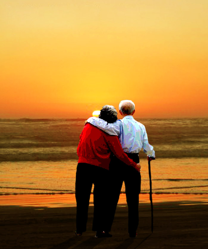 画一副夕阳西下,一对老年夫妻相互搀扶在公园散步
