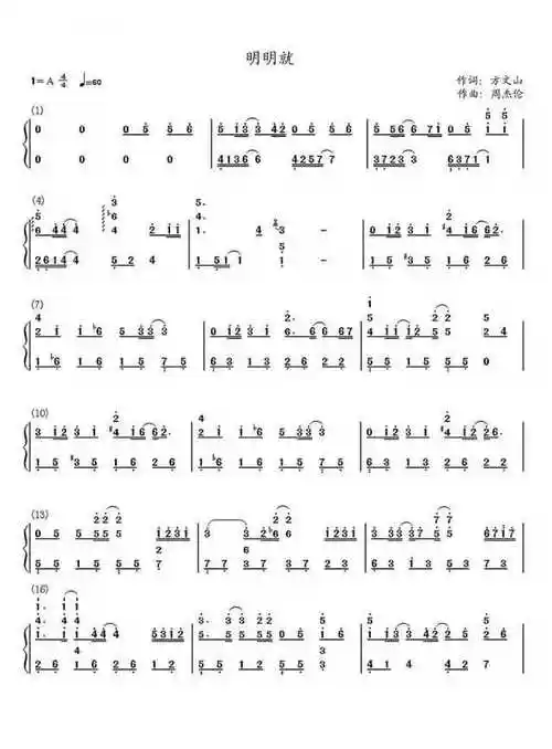 谁能帮忙找一下周杰伦明明就的钢琴双手简谱,,,,只有数字的 或者