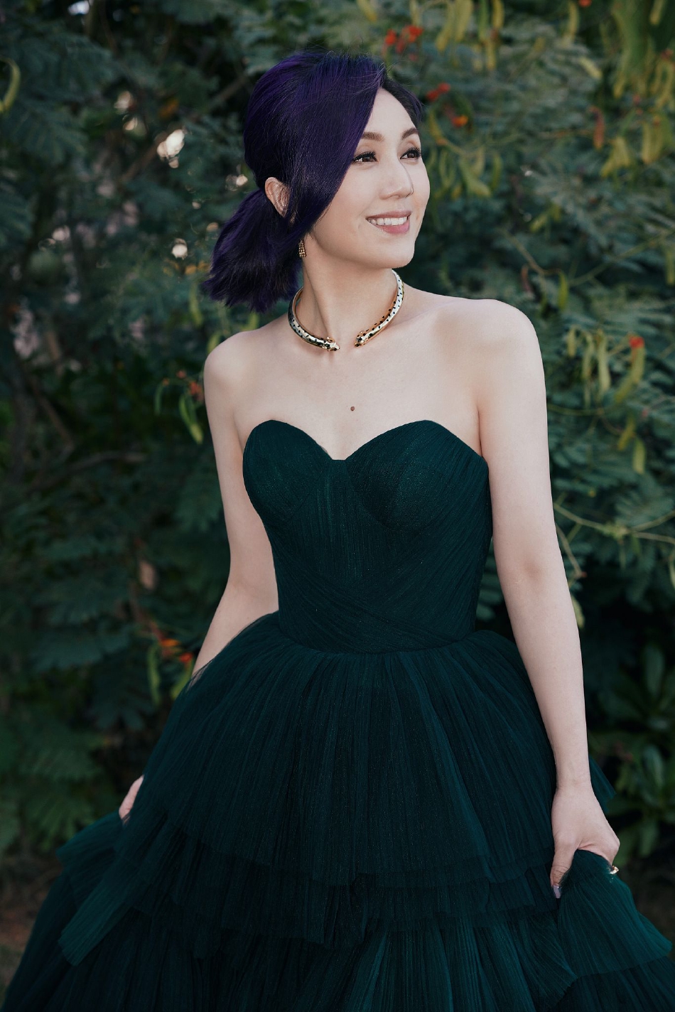 组图:杨千嬅穿抹胸蛋糕纱裙亮相金鸡奖 紫发配绿裙抢镜