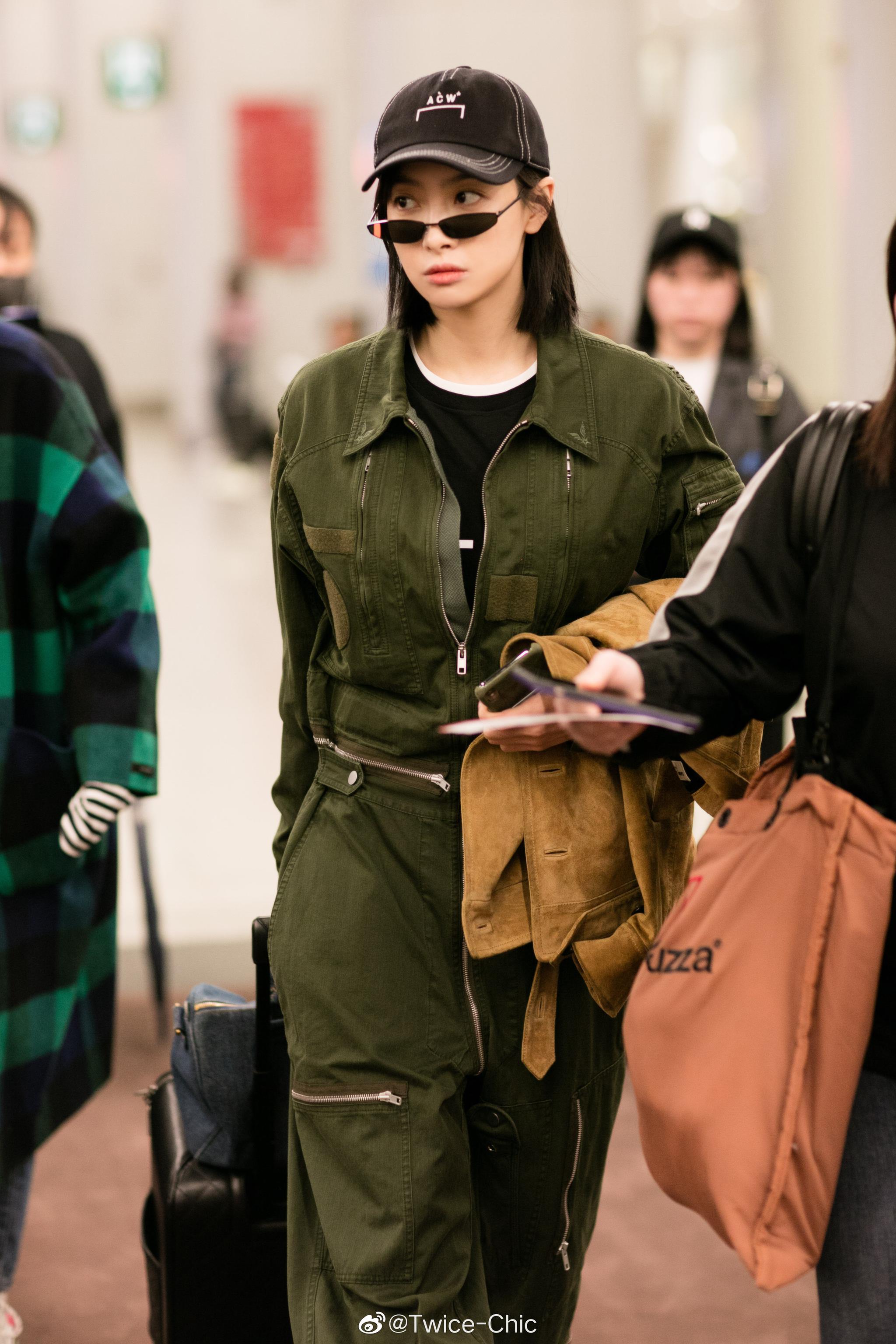 宋茜| 北京机场街拍私服,身着金属拉链细节军绿工装裤