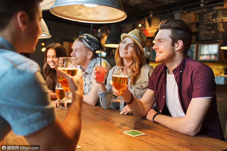 人,休闲,友谊沟通的群快乐的微笑的朋友酒吧酒吧里喝啤酒鸡尾酒饮酒