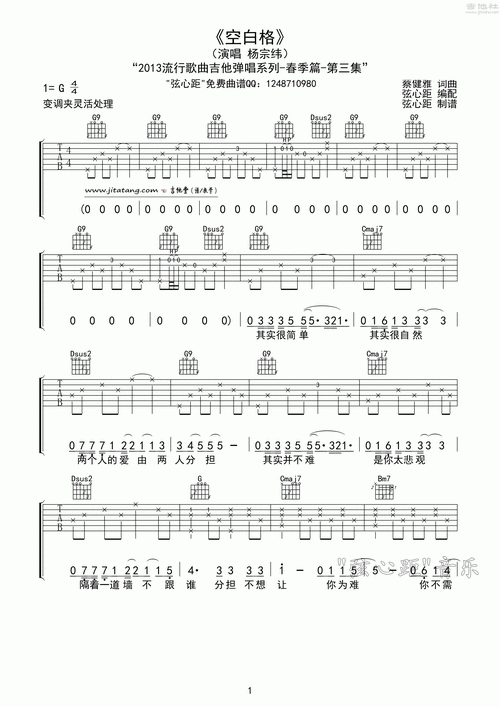 空白格吉他谱 g调简单版_弦心距编配_杨宗纬-看谱啦