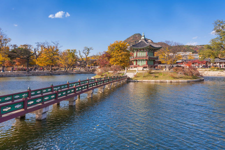 景福宫的秋天,湖蓝色的天空,首尔,韩国秋天的风景,平滑的山丘覆盖着干