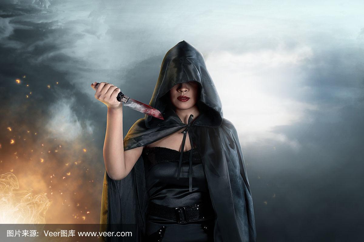 黑女巫,披着黑色兜帽斗篷,手里拿着刀
