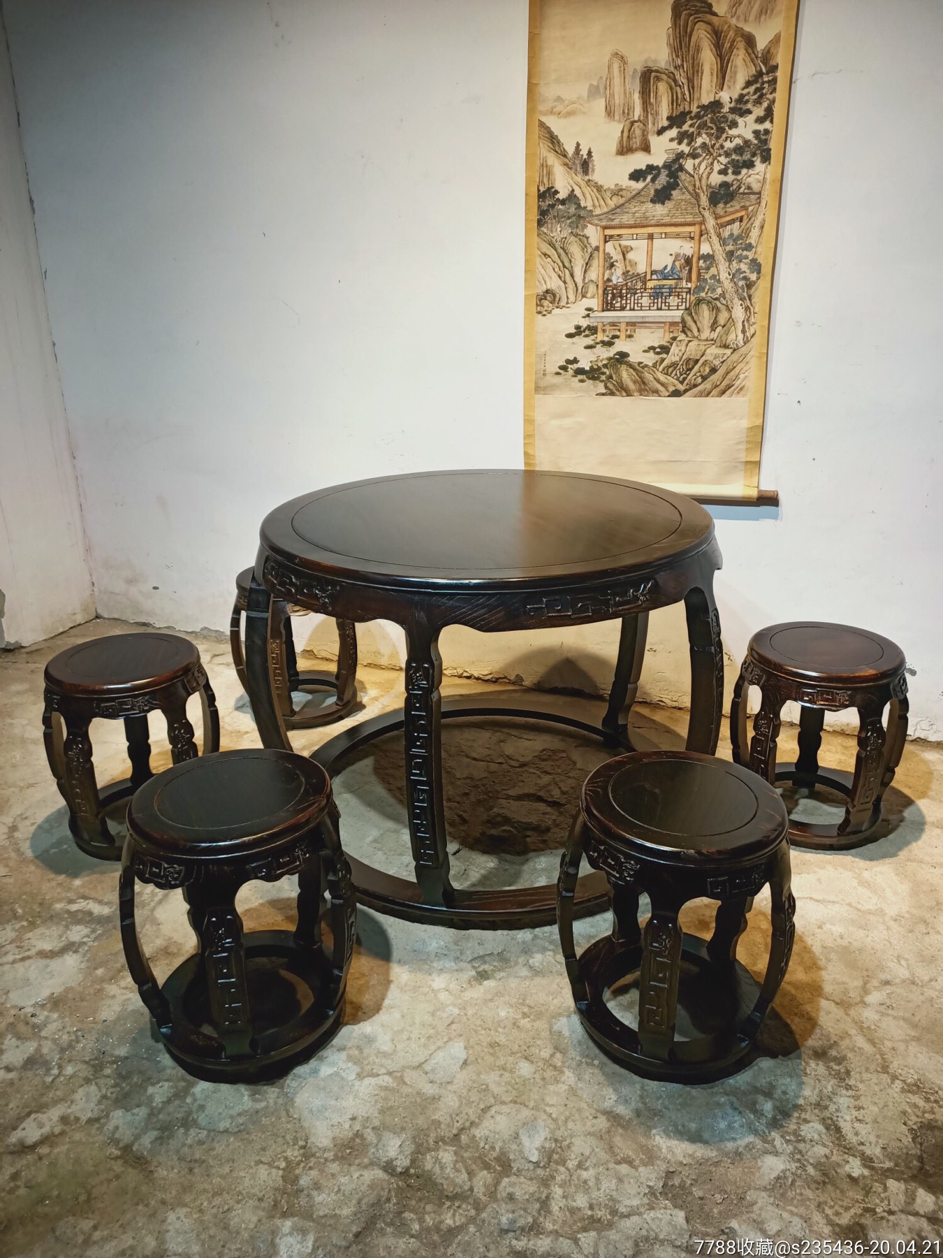 清代榆木圆桌圆凳鼓桌一套同款式墩共六件套
