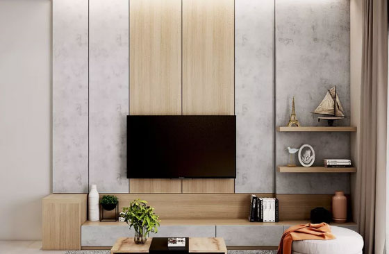 电视机背景墙以木材打造,较为雅致,让空间的颜色看起来更加温馨治愈.