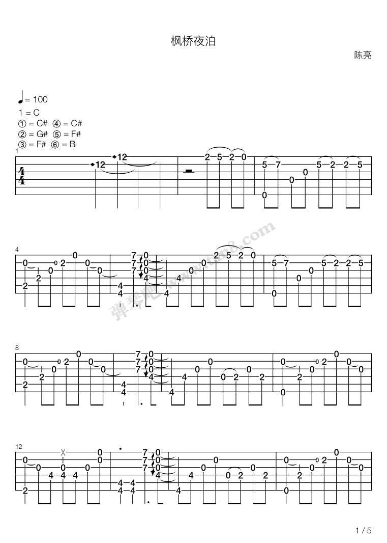 陈亮枫桥夜泊吉他谱c调吉他独奏谱