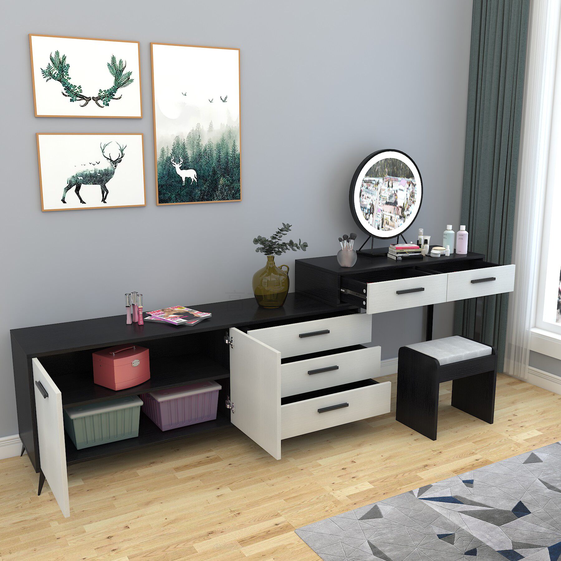 卡拉魔法轻奢灰色梳妆台收纳柜一体卧室现代简约网红ins风化妆桌