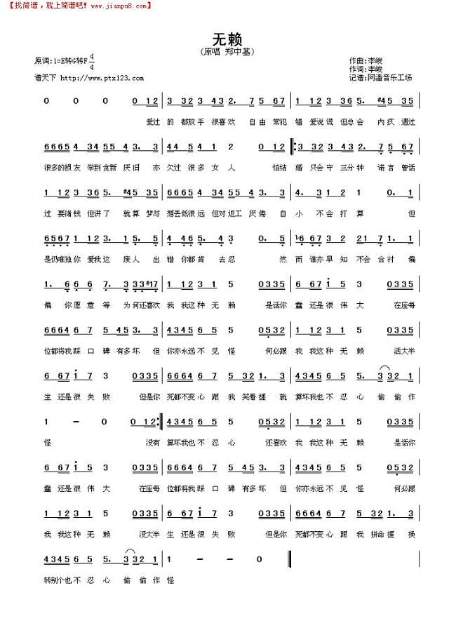 无赖 郑中基_歌谱简谱_哆来咪123曲谱网
